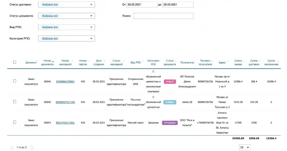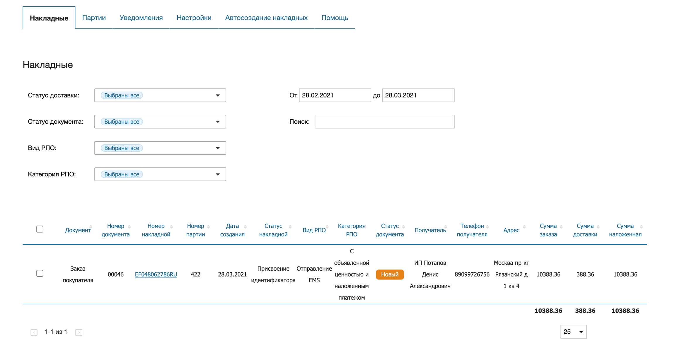 Во вкладке Накладные отображаются все созданные через виджет и автоматическое создание накладные, их текущие статусы, данные по доставке, суммарные стоимости наложенного платежа и т.д.