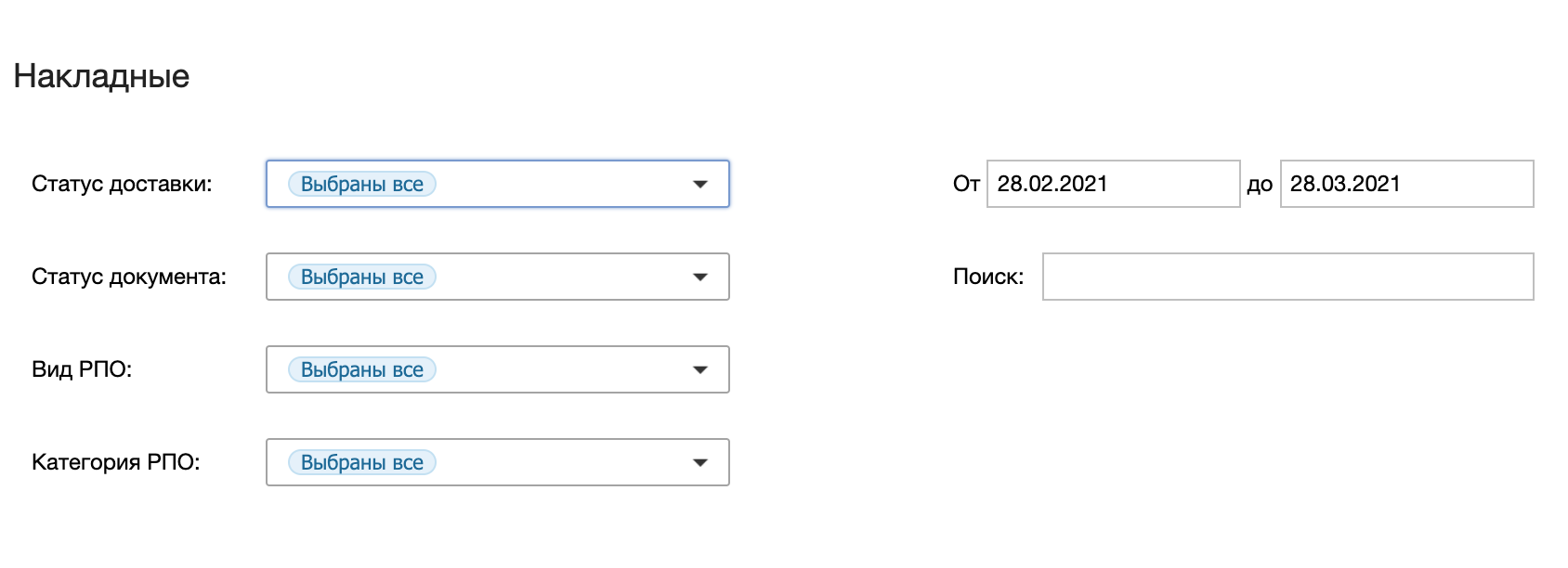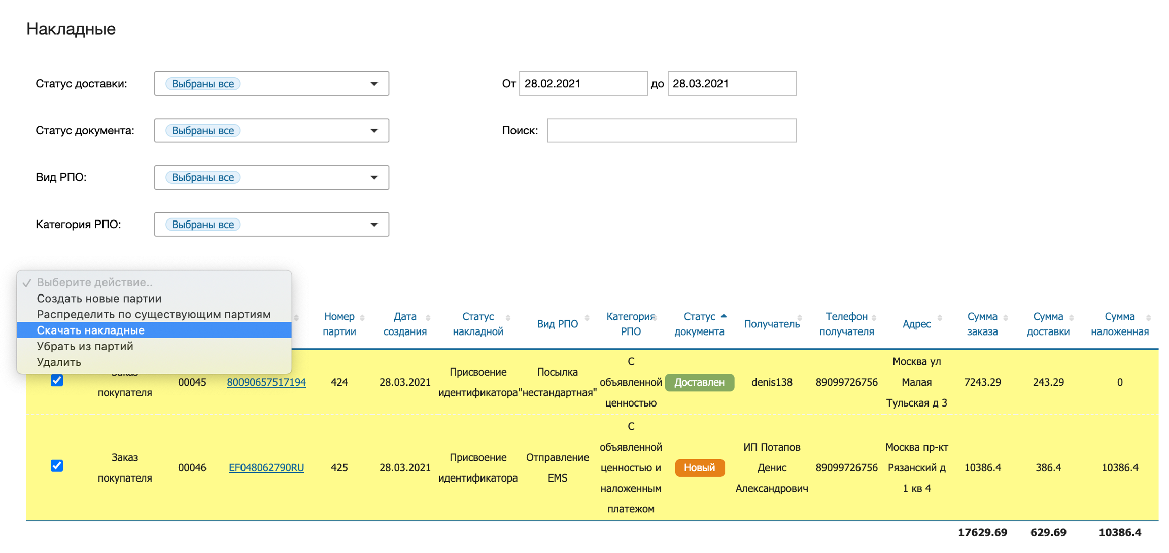 Накладные можно скачивать как единично, кликая на номер накладной, так и массово, выделив нужные накладные галочками и выбрав Скачать накладные в выпадающем меню
