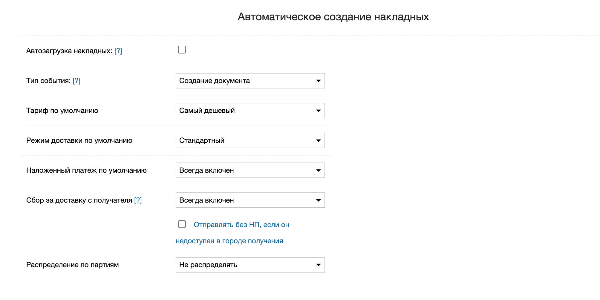 В Почте России печатные документы к накладной доступы только после распределения ее в партию. Этой опцией можно определить распределить ли автоматически созданную накладную в партию или нет.