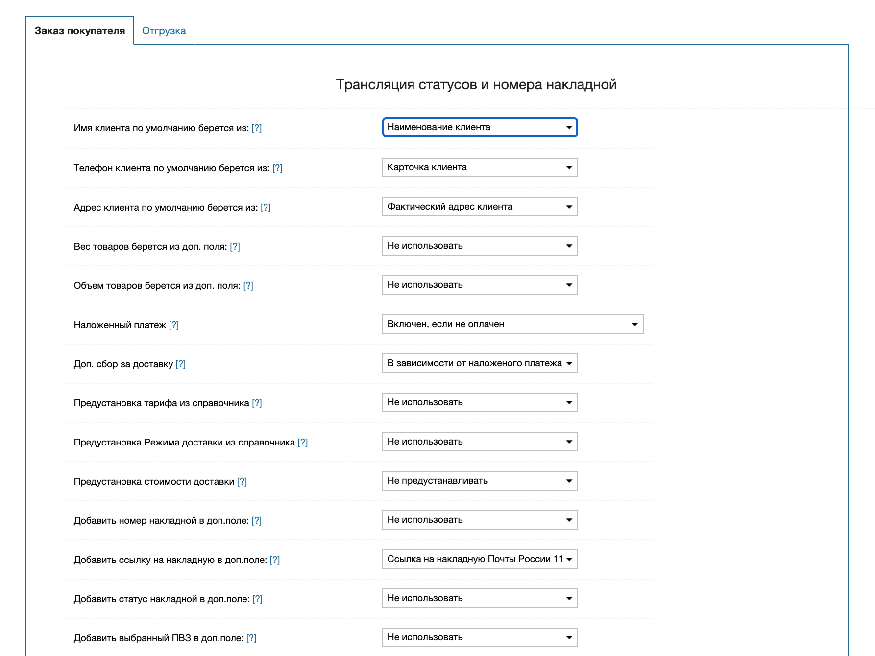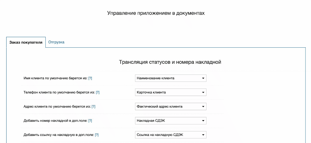 Этот раздел позволяет настроить работу приложения (трансляцию статусов из Почты, передачу данных накладных в доп. поля) с различными видами документов (заказ покупателя, отгрузка)