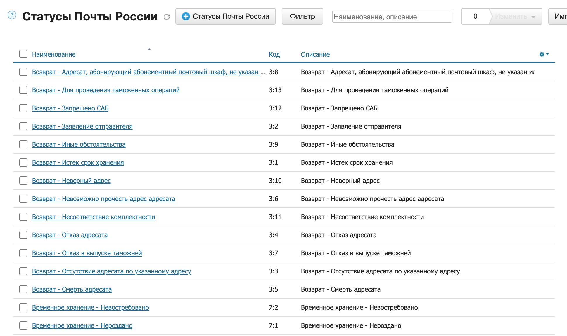 Трансляция текущего статуса накладной в доп. поле документа. При установке приложение добавляет в МоемСкладе справочник Статусы Почты России и создает доп. поле документа Статусы Почты