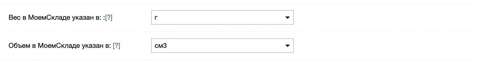 Если выбран вариант Использовать габариты и вес позиции, если они установлены в МойСклад, пользователю предлагается указать единицы измерения, в которых эти значения прописаны в карточке товара.