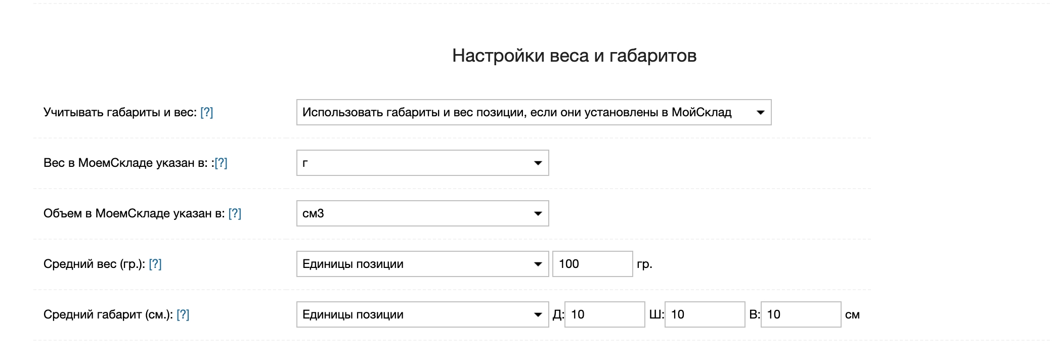 Игнорировать габариты и вес позиции, даже если они установлены в МойСклад. В этом случае для расчета стоимости будут использованы значения среднего веса и габаритов из приложения, игнорируя данных из МоегоСклада.