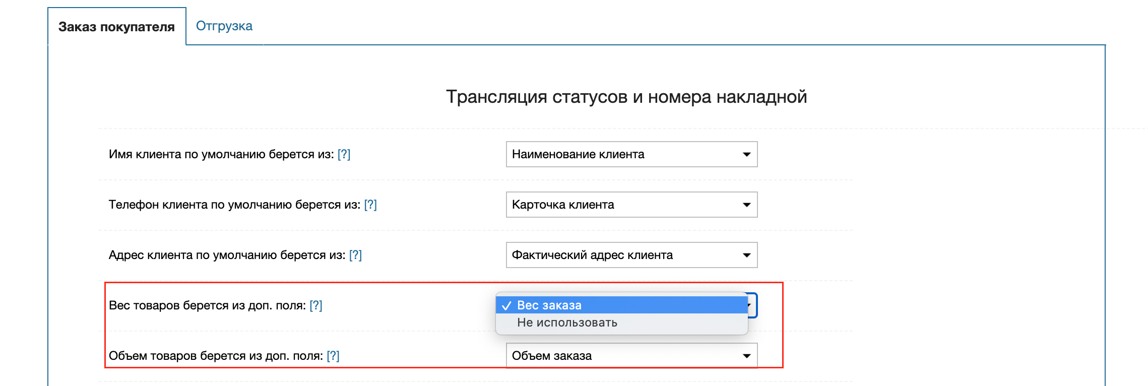 Данные настройки отвечают за корректную передачу значений веса и габаритов из МоегоСклада в Почту России. На основании этих настроек будет рассчитаны параметры отправления в виджете приложения и при автоматическом создании накладных.