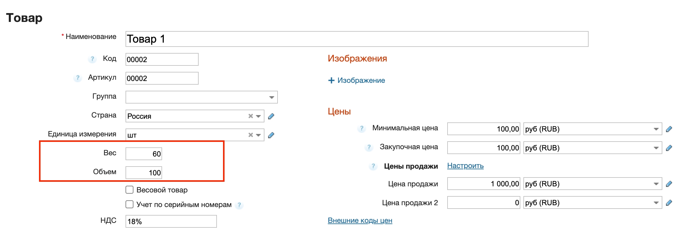 Использовать габариты и вес позиции, если они установлены в МойСклад (карточка товара). В этом случае, приложение будет брать значения веса и габаритов из МоегоСклада, если они имеются в карточке товара (поля Вес и Объем, см скриншот ниже).