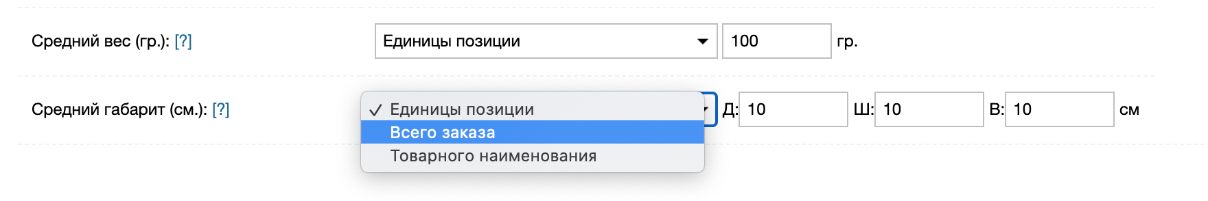 Данные параметры используются приложением, если вес или объем не задан в карточке товара МойСклад.
