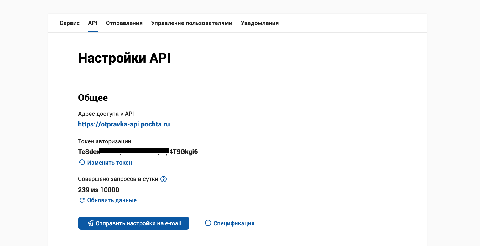 API-токен от личного кабинета сервиса "Отправка" Почты России