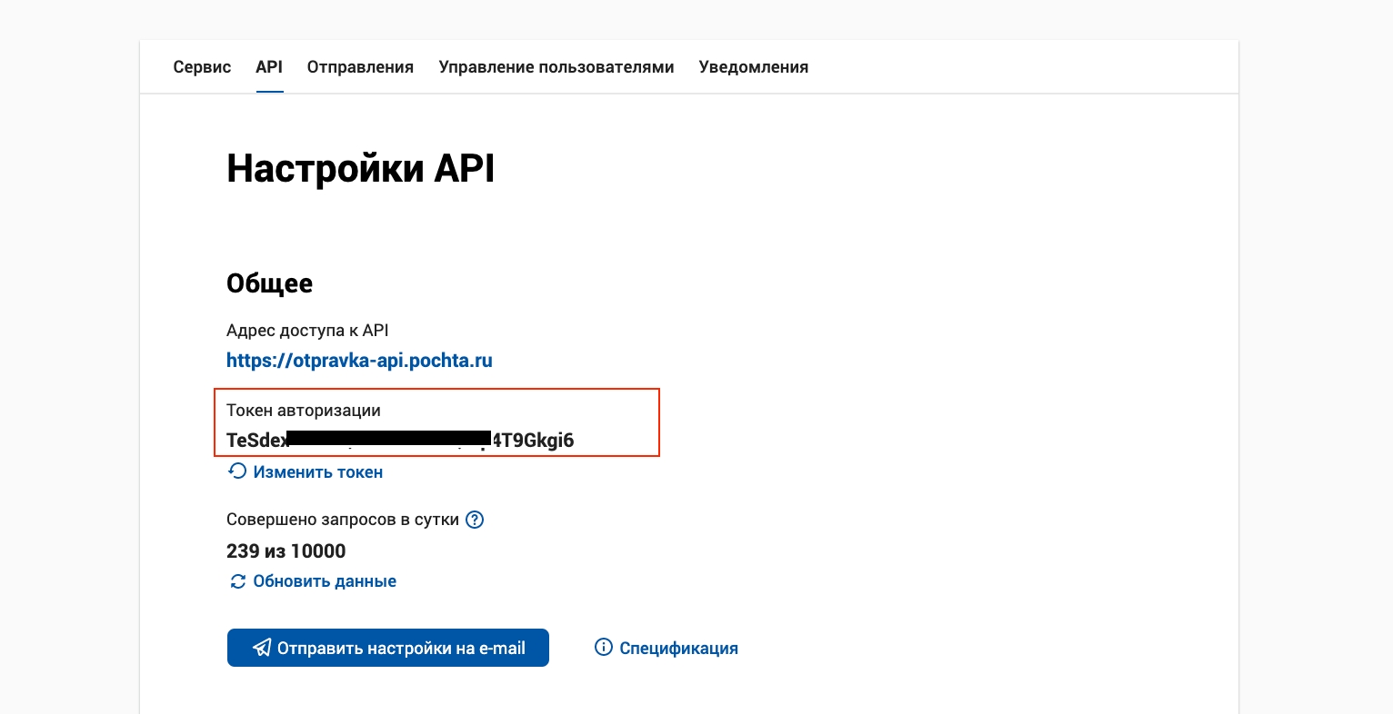 - API-токен от личного кабинета сервиса "Отправка" Почты России