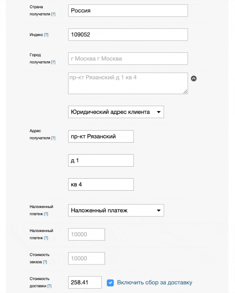 Важно заметить, что страна, индекс, город, улица, дом и квартира валидируется через сервис Dadata (для России) и Google Maps API (для международных). Правильность распознавание этих данных не гарантируется, поэтому при оформлении стоит уделять отдельное внимание полям адреса.