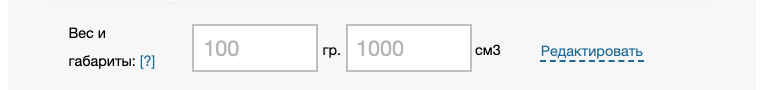 значений веса и габаритов из карточки товара