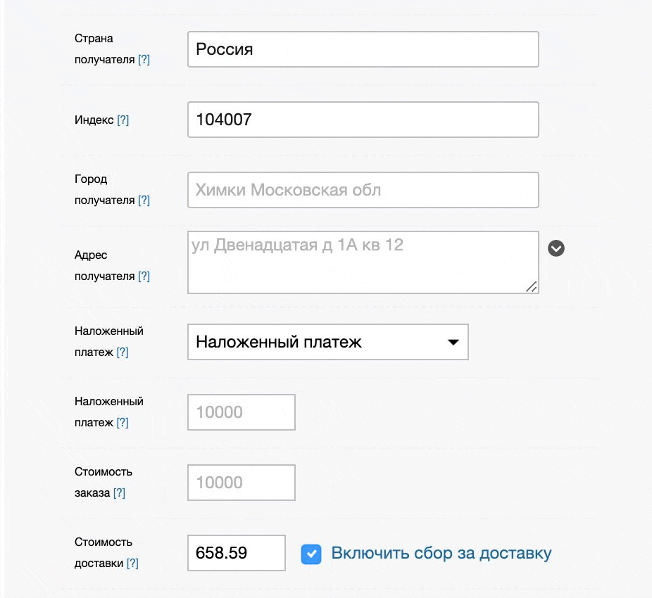 Если сбор за доставку включен, доставку оплачивает ваш клиент и при получении заказа он заплатит помимо наложенной стоимости заказа сбор за услуги Почты России.