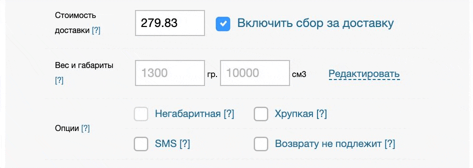 Во всплывающем окне доступно редактирование веса, габаритов, стоимости и наложенной суммы.