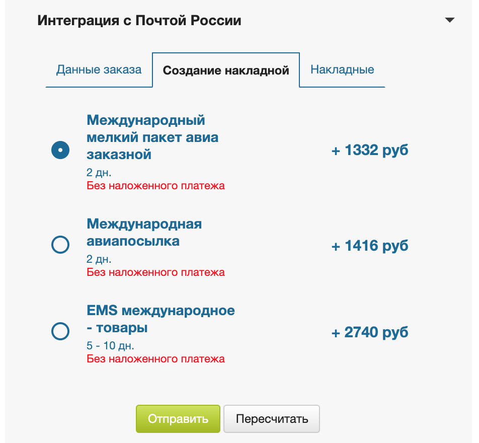 В этой части виджета выводятся точки ОПС и стоимость по тарифам, доступным для отправления по заданным параметрам из вкладки Данные заказа